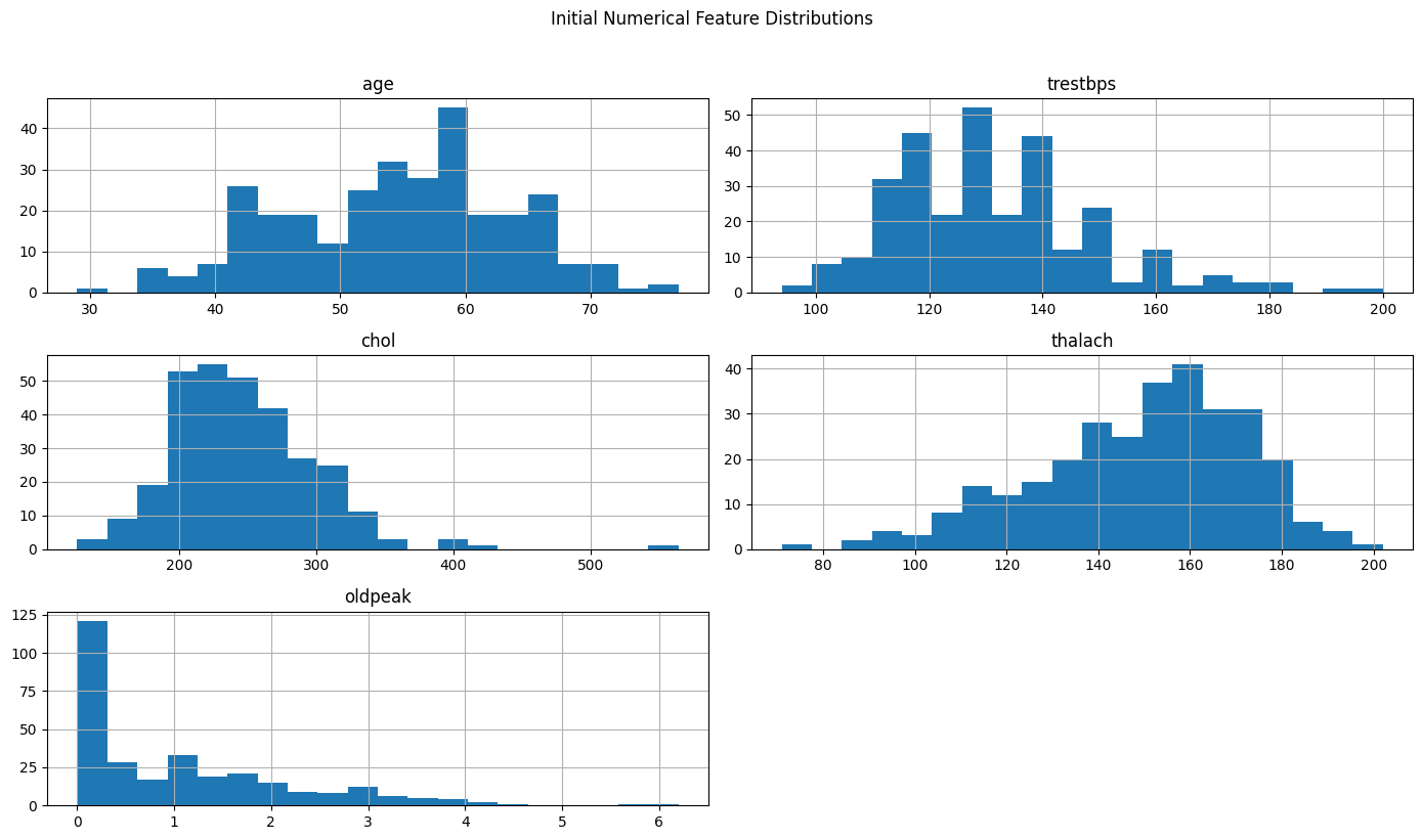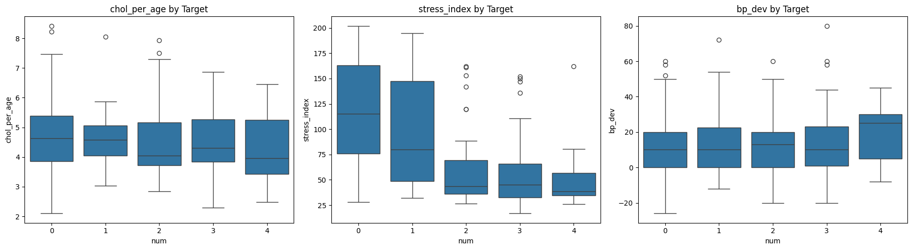 df.head()| age | sex | cp | trestbps | chol | fbs | restecg | thalach | exang | oldpeak | slope | ca | thal | num | chol_per_age | stress_index | bp_dev | age_bucket_1 | age_bucket_2 | age_bucket_3 | |